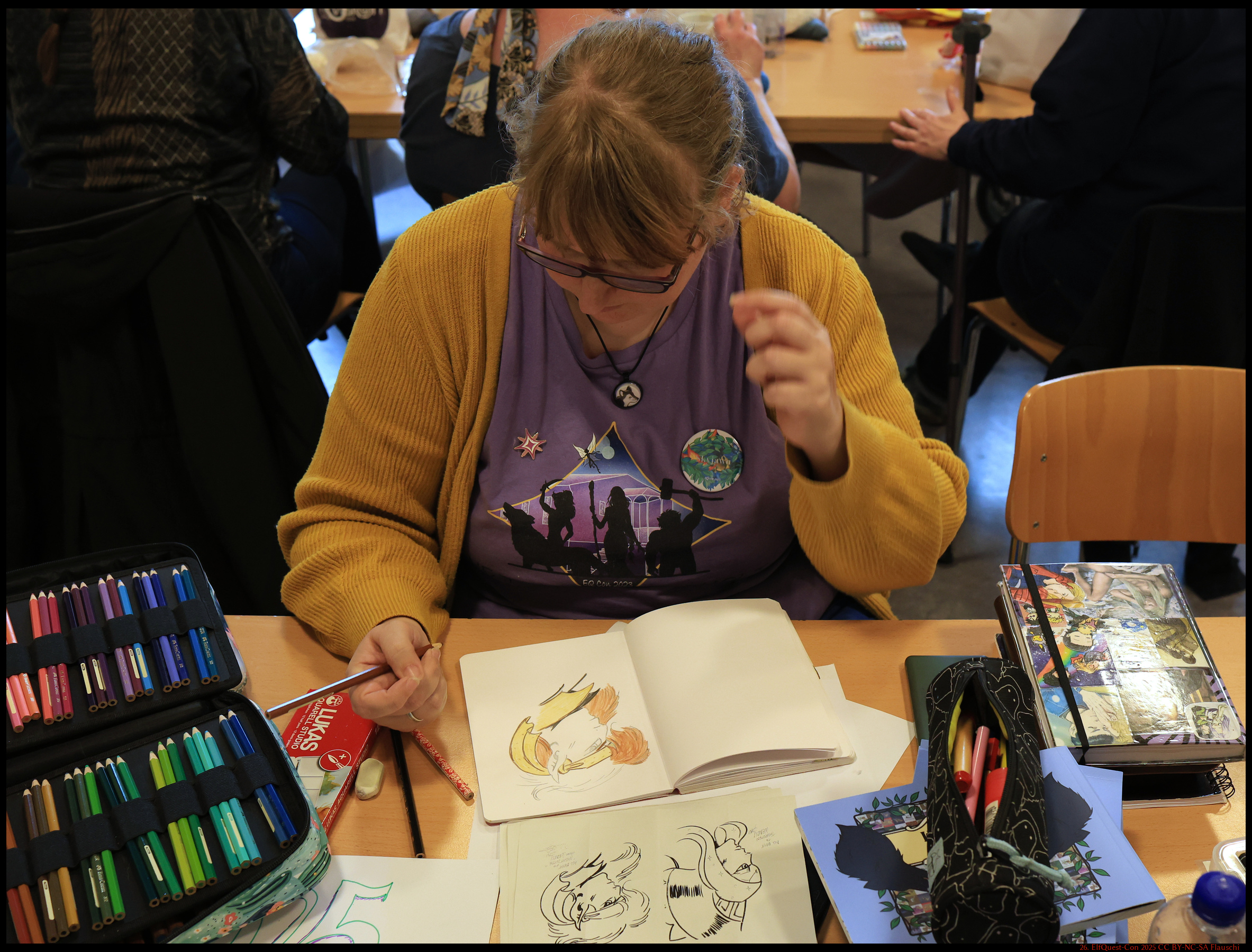 Sky schreibt in Conbücher. Bzw. malt.